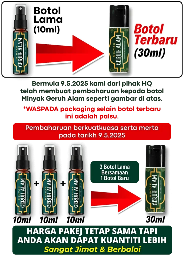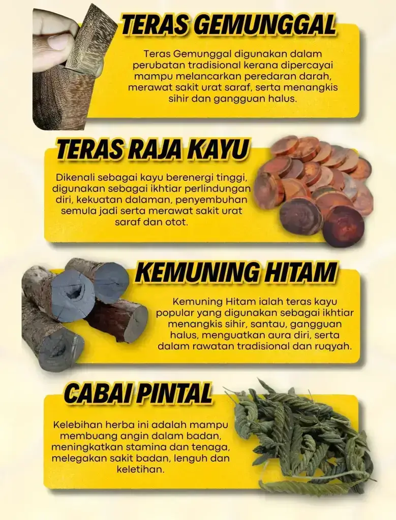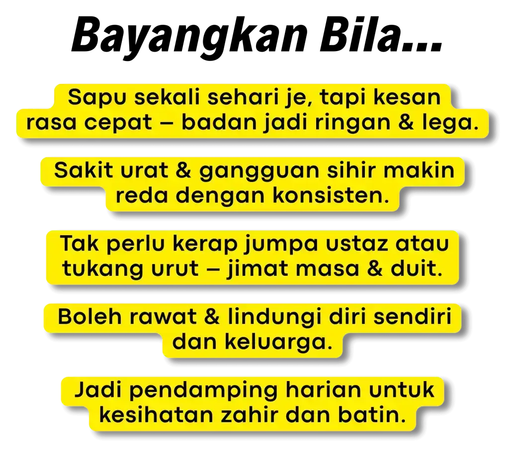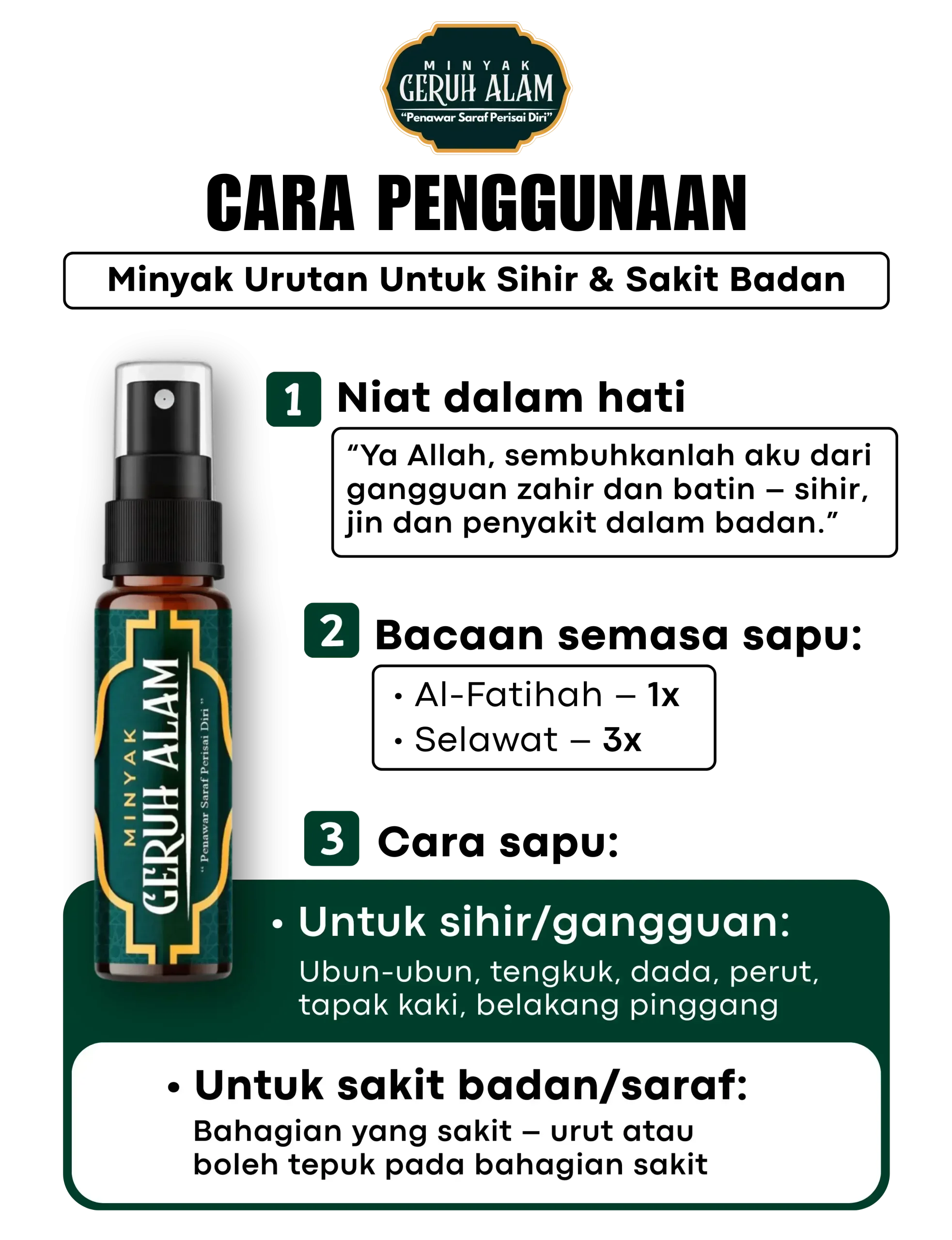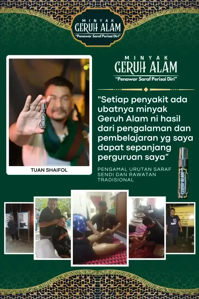 Minyak ini dirumus khas untuk urutan saraf, lenguh-lenguh badan, serta membantu masalah gangguan seperti sihir, saka dan ‘benda halus’