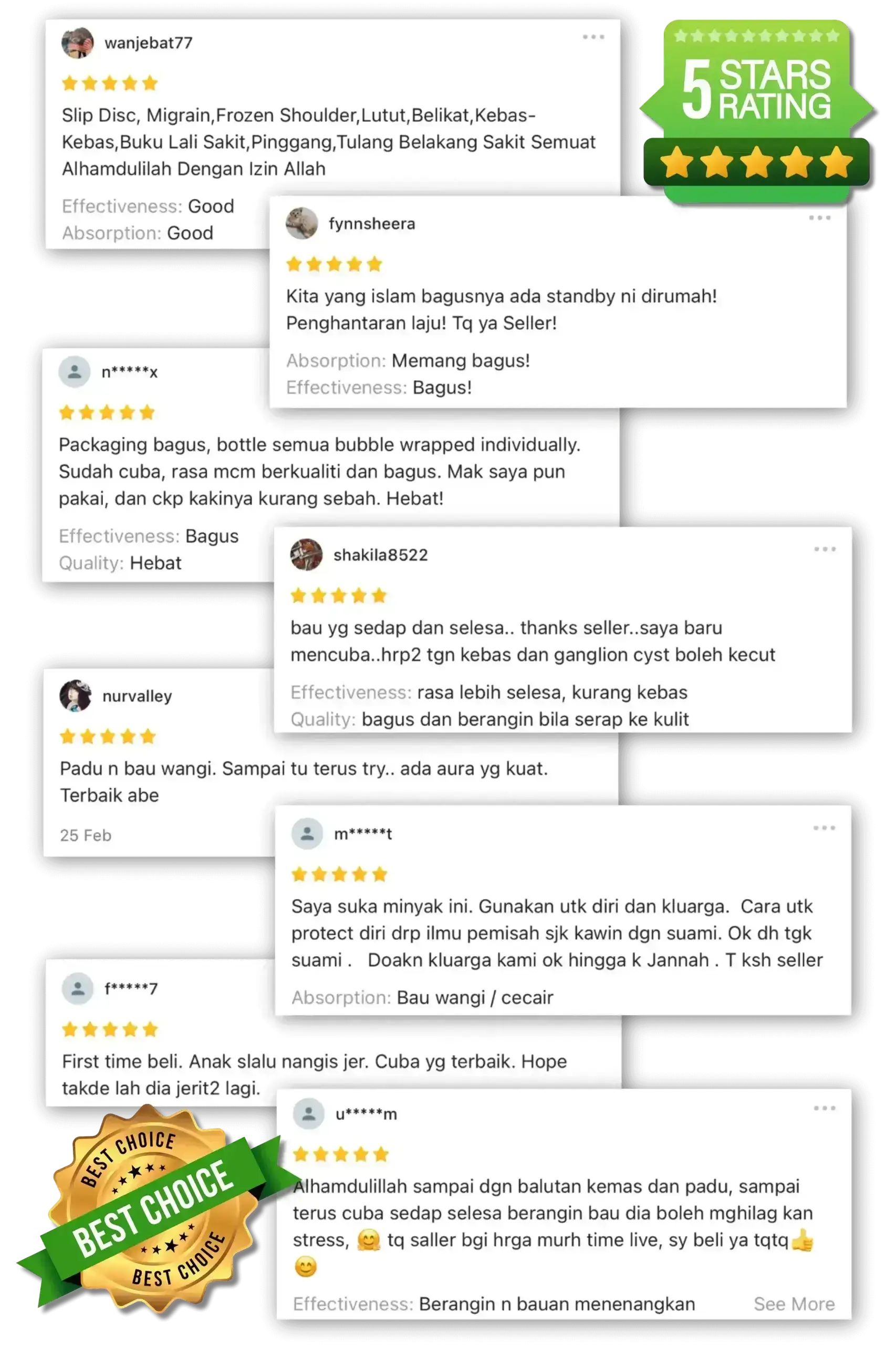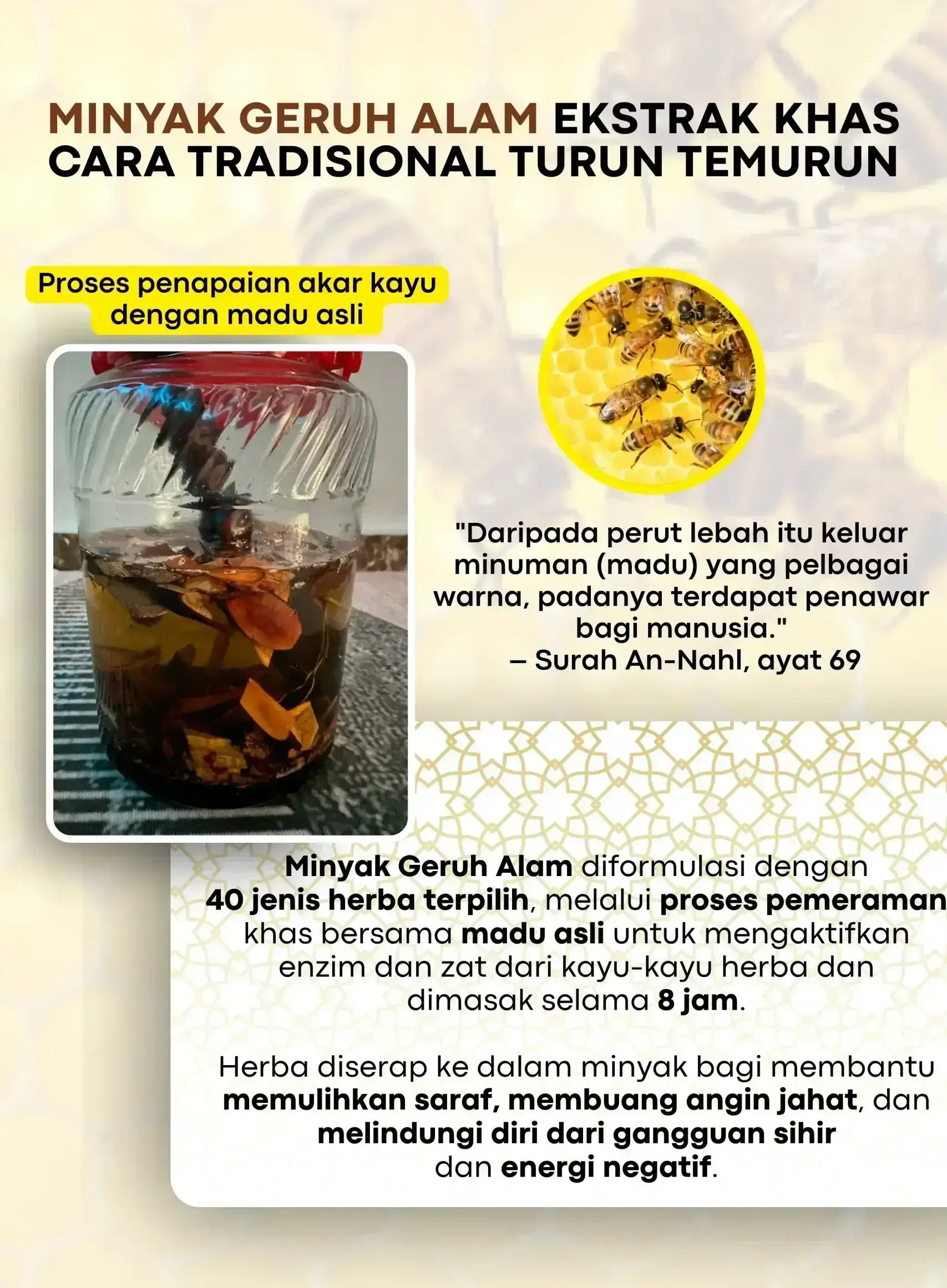 Minyak ini dibuat dari bahan semula jadi seperti minyak zaitun, herba terpilih dan pati sunnah. Tiada bahan kimia berbahaya dan selamat untuk urutan harian.