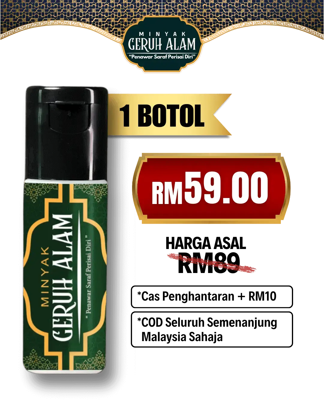 Minyak ini dirumus khas untuk urutan saraf, lenguh-lenguh badan, serta membantu masalah gangguan seperti sihir, saka dan ‘benda halus’